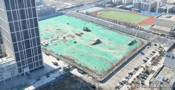 航拍可以看到,整块地块已经平整,被绿网覆盖,地块中间的位置有桩基正在施工。