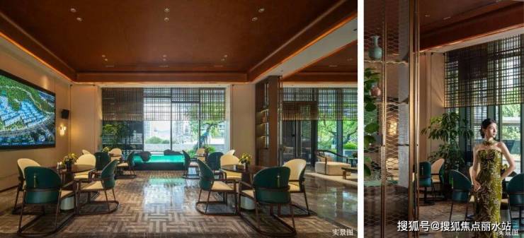 营销中心内部 设计则深植 “雅宋美学” , 色彩灵感源自李公麟《西园雅集图》的水墨基调,点缀以宋代皇家器物特有的鎏金元素,木质格栅与天然石材碰撞出温润质感。墙壁上的山水、非遗 台绣 装饰,搭配宋 韵 文人书画,将 “西园雅集”的闲适风雅复刻于现代空间。透过玻璃幕墙,室外的松石、流水与室内的陈设相互渗透,形成“一步一景,移步换景”的游园体验,让每一次转身都邂逅千年宋韵的含蓄之美。