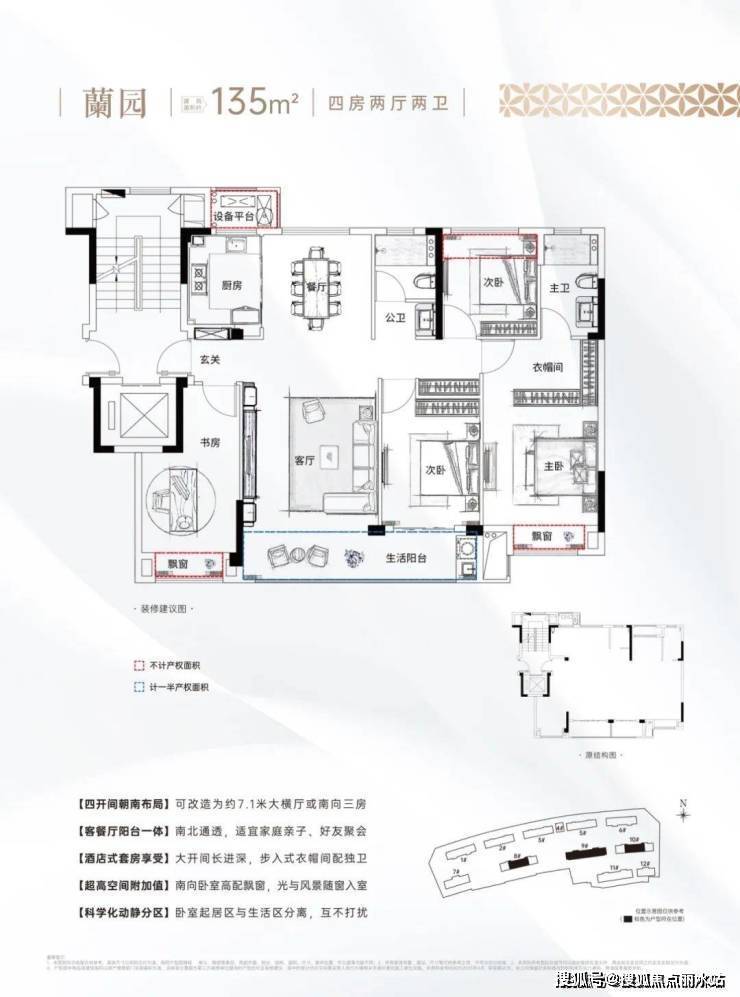 翠语兰庭建筑面积约135平户型,舒适型大四房两厅两卫。户型开间大,进深短,采光通风效果一流。户型四开间朝南,三卧朝南、主卧大套房设计,户型舒适度超高。