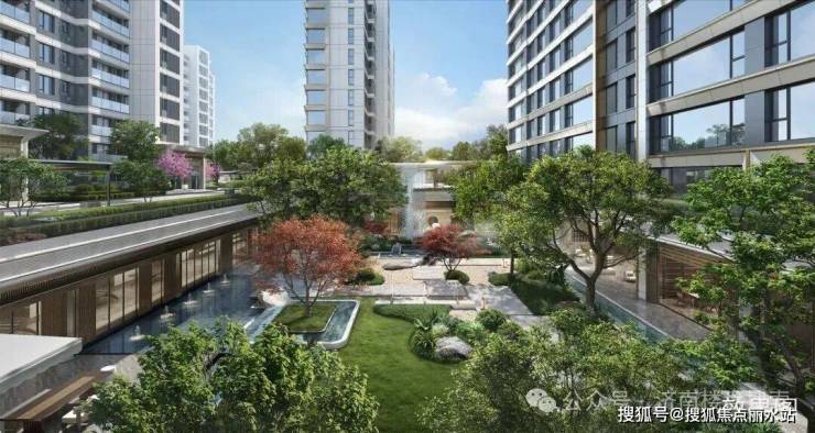 归家仪式院:云缦之庭,层叠映趣,立体山水;中庭鎏光水院:星云水瀑,四季园景,内外交融。