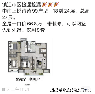从新房市场看,除了回龙山庄以外,近期青年广场中南上悦诗苑打出特价房:99㎡户型,一口价66.8万,还带精装修。