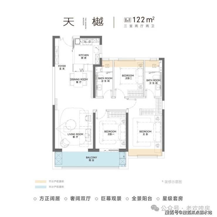 比如建面约122平的三房两厅两卫,并专门针对小家庭,进行了收纳细节,优化公摊的实用设计。