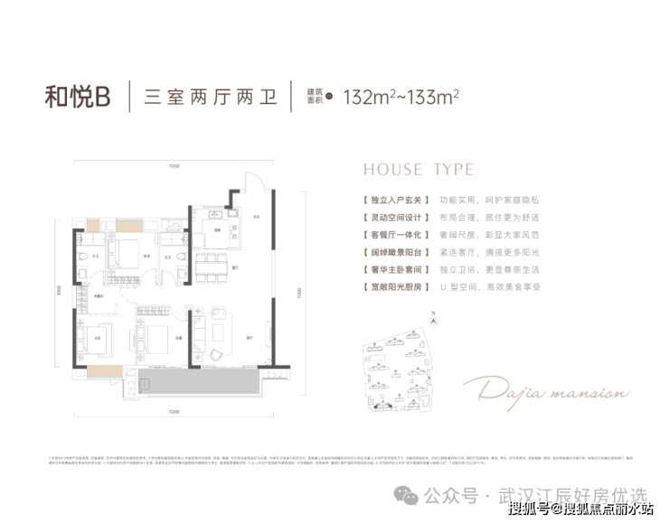 三开间朝南,南向面宽和进深会更大,开间接近10米;动静分区,公区一体化设计,客厅与南向次卧没有承重墙的限制,改造性更强,也可做大横厅;全屋三飘窗+大阳台,更多的可拓空间,更高得房率,主卧套房,自带步入式衣帽间和独立卫生间。