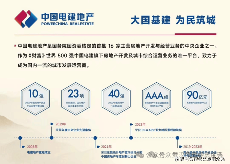 中国电建地产是中国电力建设集团的全资子公司,全国地产行业前 50 强,是国务院国资委批准的首批 16 家央企地产企业之一,同时拥有房地产开发企业壹级资质,资信等级 AAA 级,注册资金 90 亿元。中国电建地产已在北京、上海、广州、深圳等 32 个城市开发运营 140 余个地产项目。售楼处电话400-8787-098接通后输入5678【营销中心】