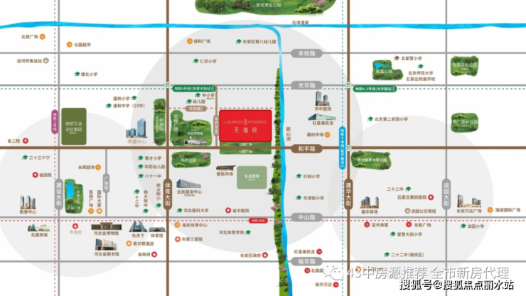 【公园配套】:东临约40公里民心河景观长廊,南侧为华药公园,西侧是规划中的市政公园、广场,华药历史博物馆等