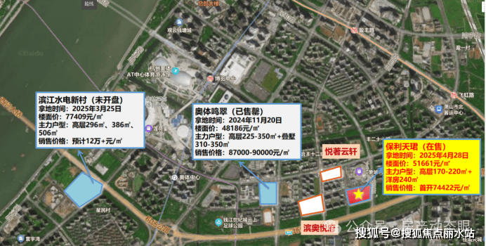 同样是奥体板块,2025年入市的板块首个不限价新盘奥映鸣翠府,首开均价直接跃升至86978元/㎡,相较此前限价涨幅高达89.1%,收官阶段更是涨至90550元/㎡,楼王房源备案价突破10万元/㎡,且每次开盘都遭遇疯抢。滨江水电新村更是网传销售价格达到13.5万元/㎡。