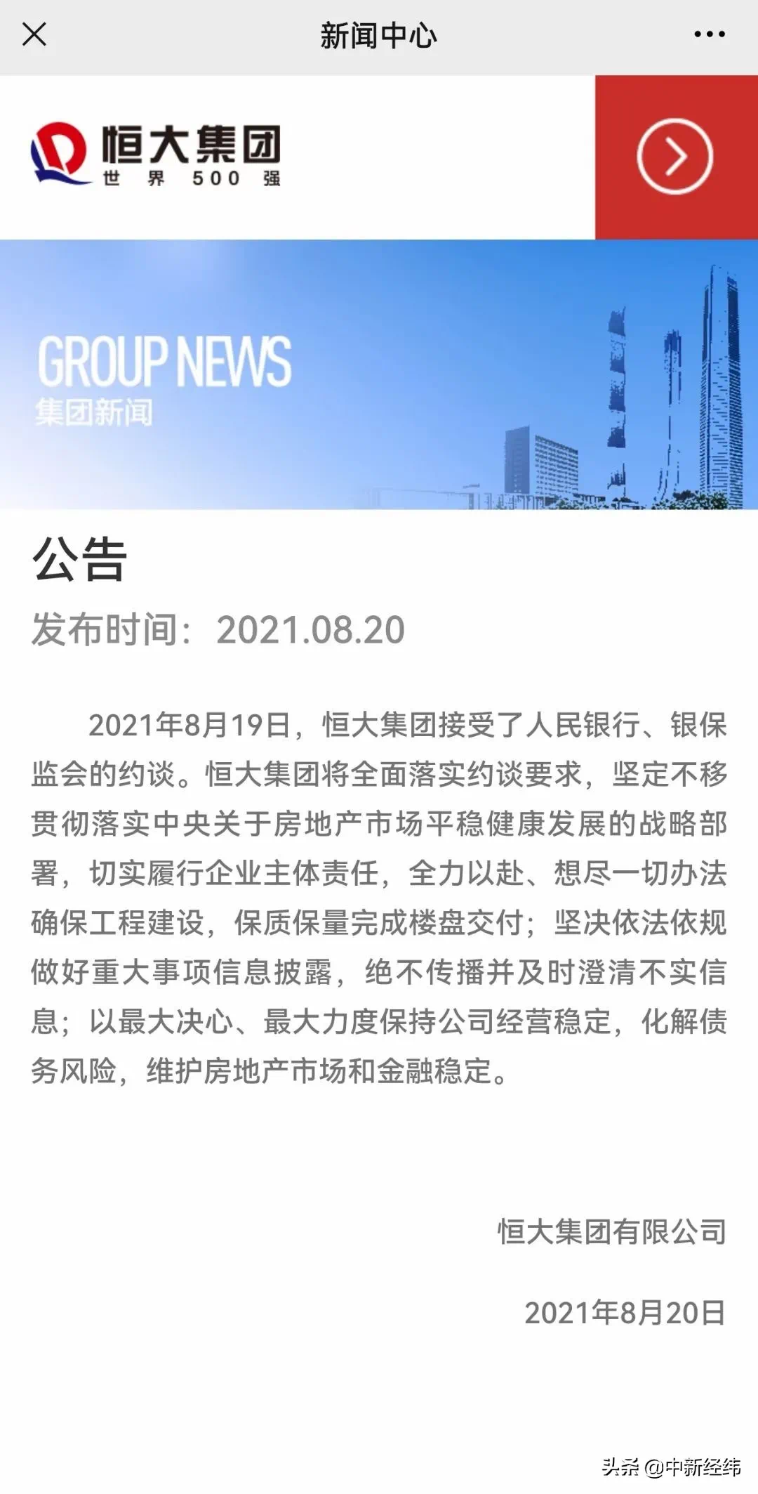 8月20日凌晨,恒大发布公告回应被人民银行、银保监会约谈。恒大表示,将全面落实约谈要求,坚定不移贯彻落实中央关于房地产市场平稳健康发展的战略部署,切实履行企业主体责任,全力以赴、想尽一切办法确保工程建设,保质保量完成楼盘交付;坚决依法依规做好重大事项信息披露,绝不传播并及时澄清不实信息;以较大决心、较大力度保持公司经营稳定,化解债务风险,维护房地产市场和金融稳定。