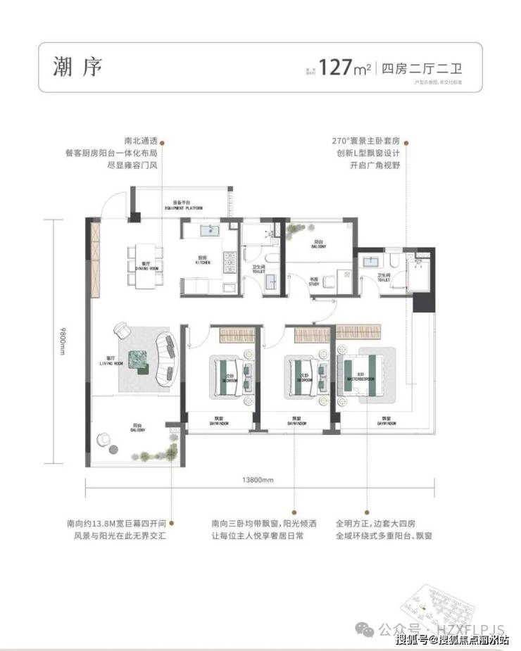 揽景小高层建筑面积约105-130㎡,为最大化景观面,突破性设计建筑面积约105㎡南向四开间。