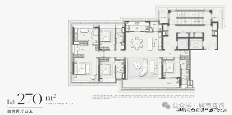 建面约270㎡户型,在空间布局上堪称建面约240㎡户型的“放大版”——