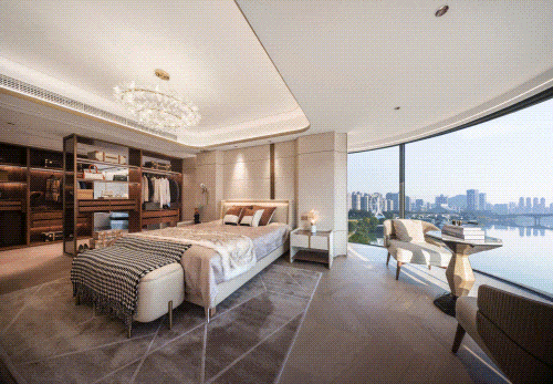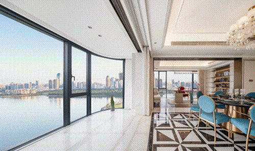 更令人惊艳的是近14米的270°环幕阳台,将江岸风光框景入室,晨雾、波光、落日皆成生活背景。