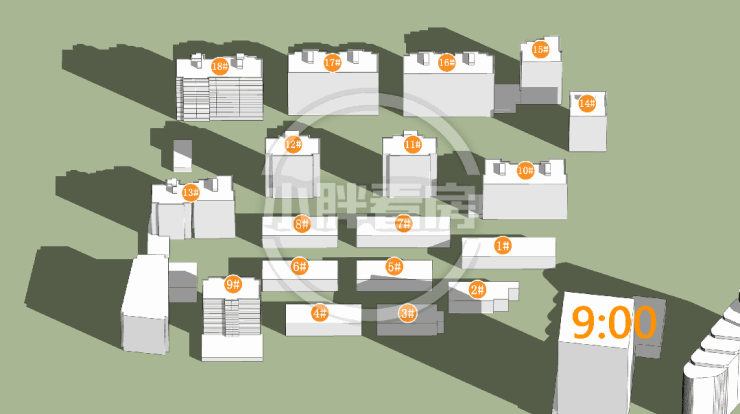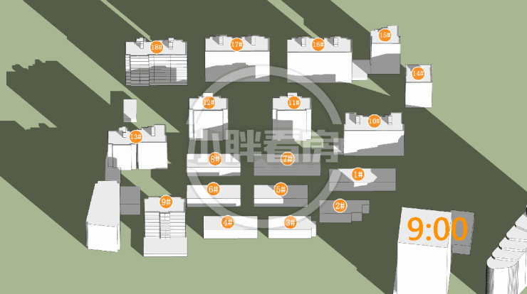 冬季:9#采光优异几乎不存在遮挡。18#中低层受遮挡。就具体遮挡时间而言,18#主要在上午受12#遮挡。