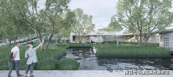 在公共景观与项目景观交汇处通过景墙、草坡、水景、管控门多种消隐边界的处理手段,达到公共景观与项目景观的融合与区隔,无须围墙,即可将项目融于江岸绿化景观之中,又实现了社区围合的效果。