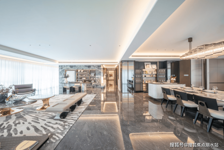 以入户玄关为中轴,将客厅、餐厅、厨房这样的公共活动空间,和卧室这种私密空间分隔开,房子动区和静区的布局泾渭分明,成功营造了一个既奢华又温馨、既私密又开放的理想居所。