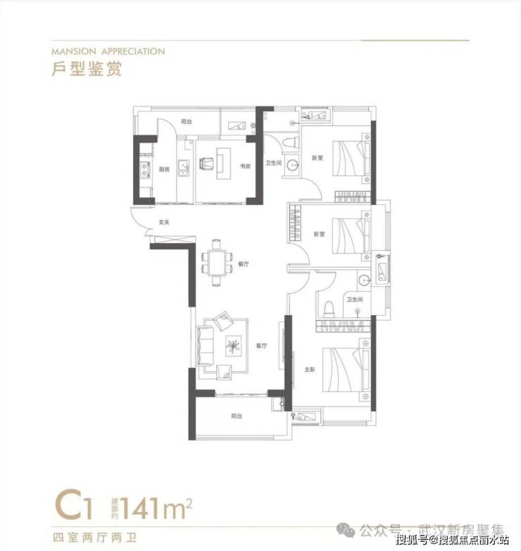 C1户型——138㎡四室两厅两卫阳光四局:格局方正,动静分区双面揽境:南北双阳台,约7.3M南向阳台景观飘窗:户户赠送宽景飘窗,奢配主卧:独立卫浴,臻配步入式衣帽间