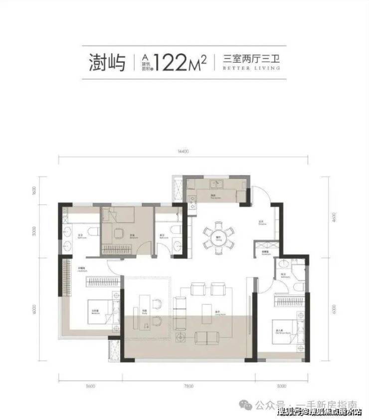 该户型为中间户,3开间朝南,南向面宽约10米,尺度还是比较阔绰的,而且该户型还做了三房,主卧约18.4平,另外两个次卧开间尺寸也达到约2.8-3米,空间感、功能性都比较舒适。