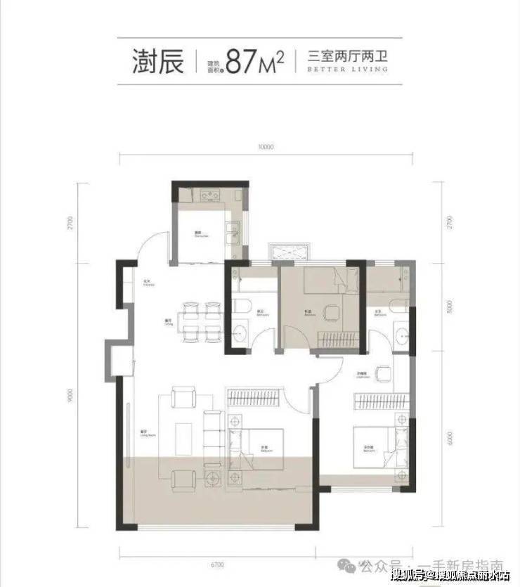 建面约87㎡三房两厅两卫
