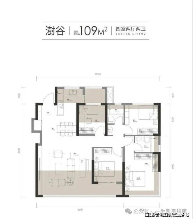 2号楼两个端头边户和1号楼东边端头户型,南北通透,三开间朝南,建面虽然只有109平却做了四房,还有大横厅,而且每一个房间空间都比较阔绰。