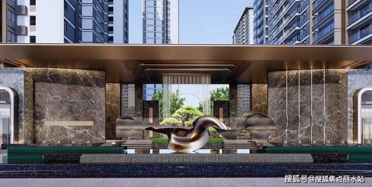 共约1000平入户大门,总长度近26米, 大门铝材配合大理奢石,整体效果恢弘时尚。