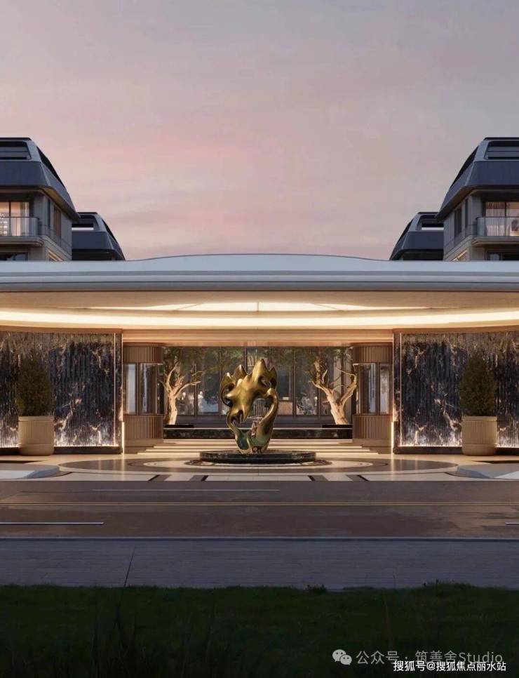 进入园区,迎面而来的是前庭两株苍劲的紫薇老树,仿佛伸开双臂欢迎每一位访客。园区中轴线上,两侧对称地盛开着杭州市的市花——丹桂,它们在法式园林的轴线布局中,巧妙地融入了东方的审美意趣。此外,水景的底座选用奢华石材精心镶嵌,为整体景观增添了一抹独特的艺术气息。
