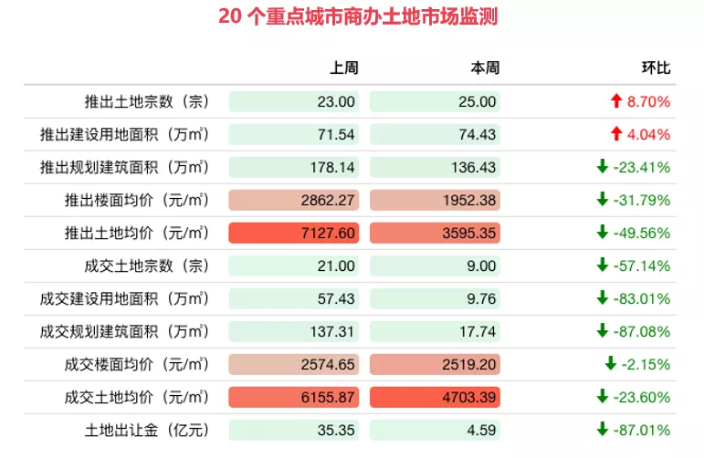 土地市场:本周商办土地市场推出方面量增价跌、成交方面量价齐跌,土地出让金4.59亿元