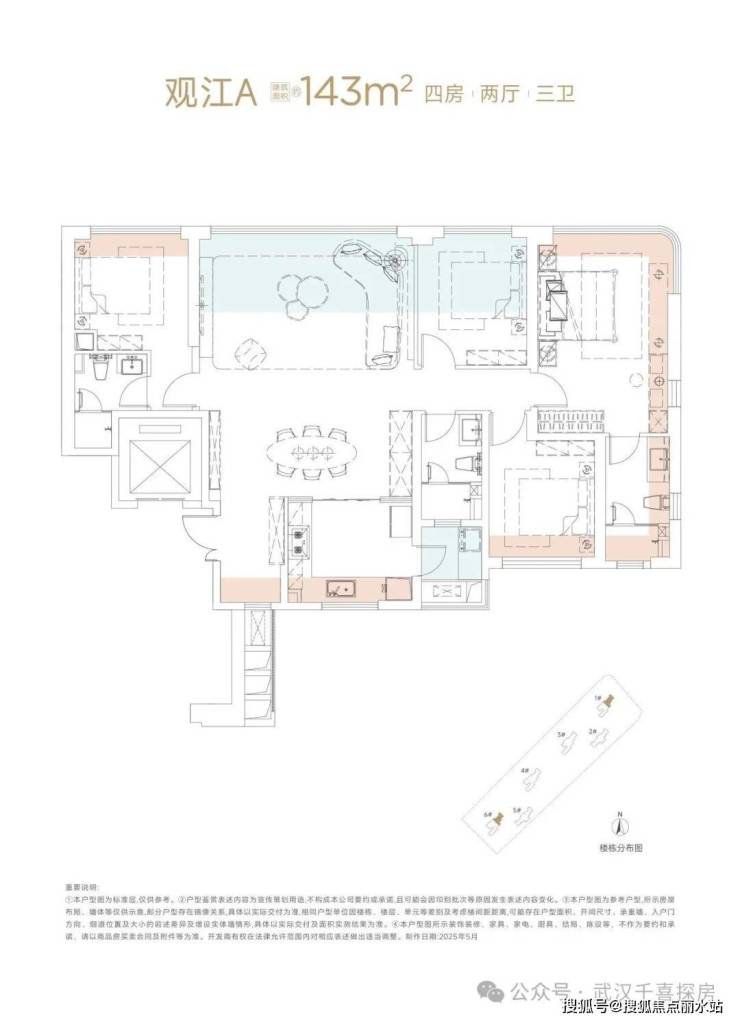 2.项目规划6栋住宅,4栋30-31层高层 + 2栋44层超高层,全部东南-西北朝向,一字错位排布确保每栋无遮挡观江.