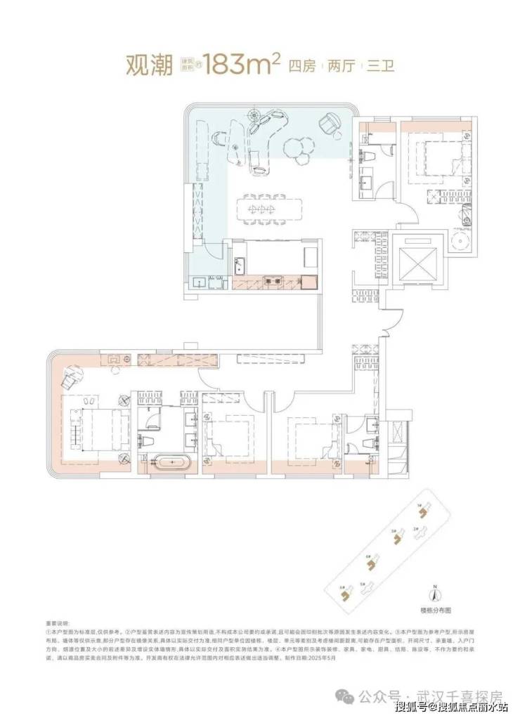 143㎡户型配约9米瞰江横厅,183㎡户型采用“双全景舱”设计,主卧270°U型玻璃幕,最大化江景视野。优化后达约113%.
