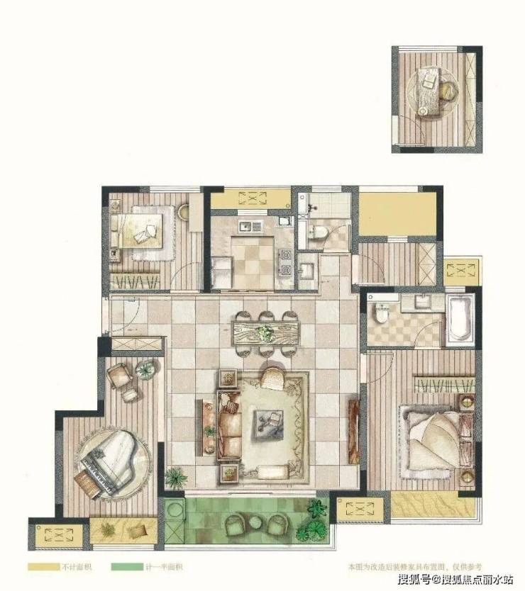 约120㎡的户型,整体是一个比较经典的“四叶草”户型,三开间两卧朝南,做了一个宽厅+单阳台的设计,主卧也采用了目前比较主流的套房设计。