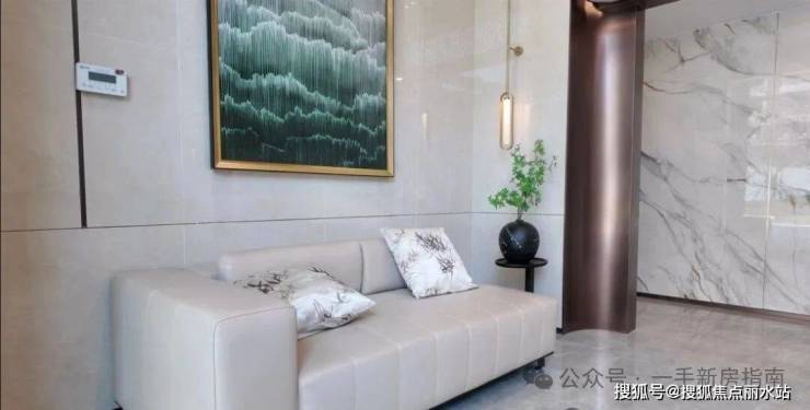 地上大堂内部通过取消展示墙,大幅提升空间感,增加视野开阔性。选用雕刻鱼肚金样式的大理石岩板、高约2.2米的艺术灯具等,呈现明朗雅致、温馨融合于一体的轻奢气质。