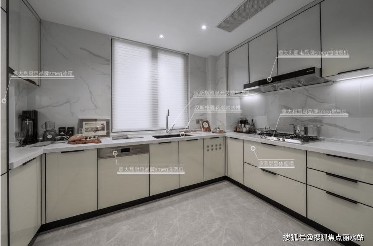 厨房电器四件套(燃气灶、抽油烟机、洗碗机、冰箱),采用意大利“国宝级”厨电品牌smeg,它是世界上最大的专业厨房电器生产商之一。