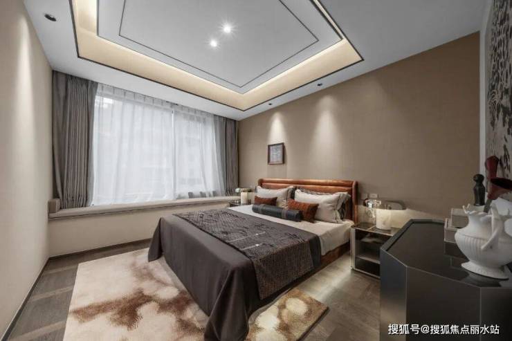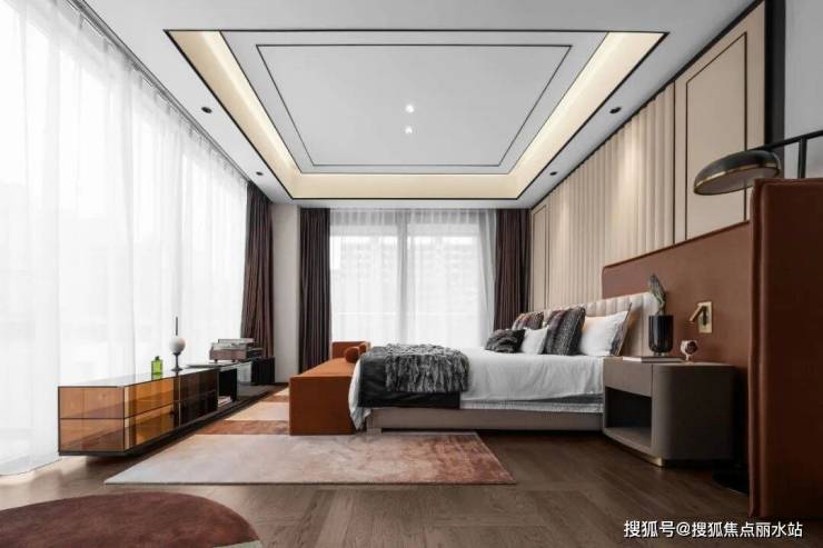 卧室则采用暖灰色调。高端皮革、金属线条穿插,定制墙布与错拼式木地板相映,营造出强烈的秩序感与几何设计感,让人恍若置身宝格丽酒店的套房之中。