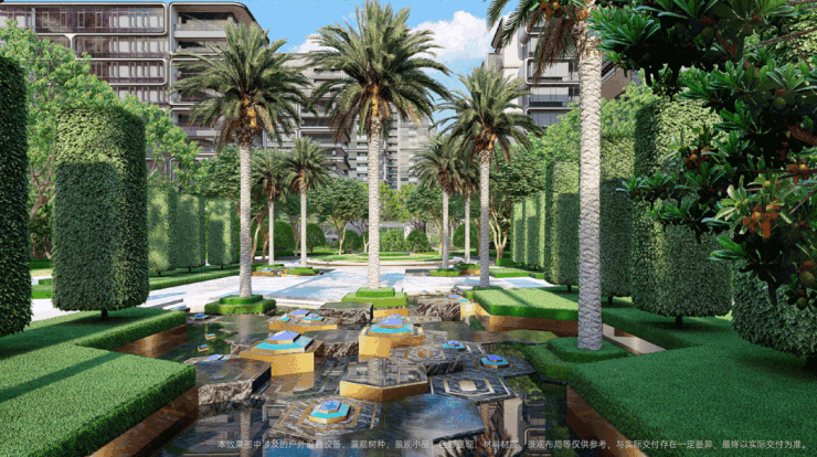 最具代表性的,是社区中心一方“瀚海千姿”超大中央花园景观,通过罗马四柱凉亭、模纹景观水池、蓝宝石定制喷泉,和具有对称仪式感的植物群,勾勒出明媚、浪漫的法国南部风格。