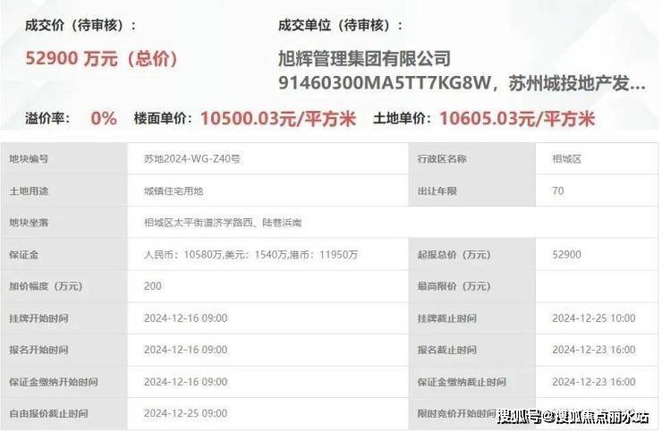 项目所在苏地2024-WG-Z40号地块,由旭辉管理集团&苏州城投地产&苏州太平城乡一体化建设发展底价拿下,成交总价5.29亿,成交楼面价10500.03元/平方米。
