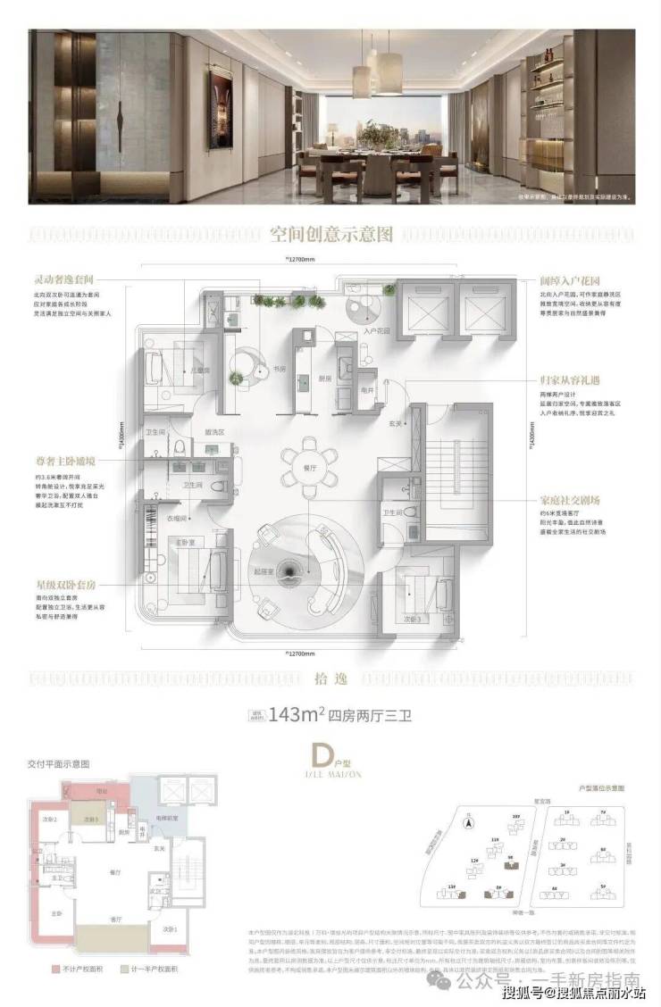 国王十字玄关实现归家动线分流,悬浮式皇后花园将“U型端厅”与“U型端房”串联,空间由此分为“社交舱”与“休憩舱”,有效平衡动静分区。