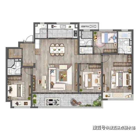 建面约168㎡的四房两厅三卫户型图