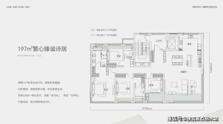 197㎡户型,四房两厅三卫,双套房设计;南向面宽高达19.1米,四面采光通风,通透性极佳;阳台进深约2.4米,双阳台加上多个飘窗,优化后得房率约95%,如果加上电梯前室的面积,得房率也可以做到接近99%。