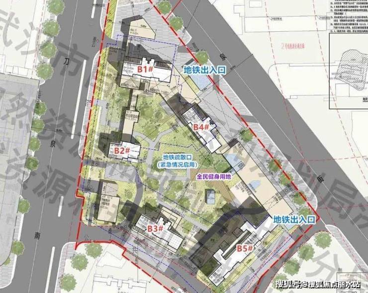 B地块有3个地铁出入口,真正的地铁上盖项目,其中地块内部的是地铁疏散口,平时关闭,紧急情况启用;此外在地块中间有个全民健身用地;项目的主入口位于卓刀泉南路,在B1#和B2#之间。