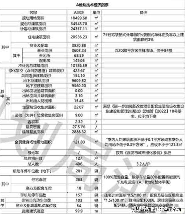 A地块规划用地面积约1万方,总建面约3.45万方,住宅建面约2万方,容积率约2.32,总户数127户,住宅机动车停车位263个。