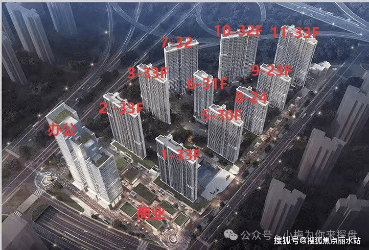 该项目共包含10栋住宅、1栋三连式的办公楼和部分商业街区以及一所幼儿园。该项目都是高层,其中1、2、3、11号楼为33层,7、10号楼为32层,6号楼共31层,5号楼共30层,8号楼24层,9号楼23层。