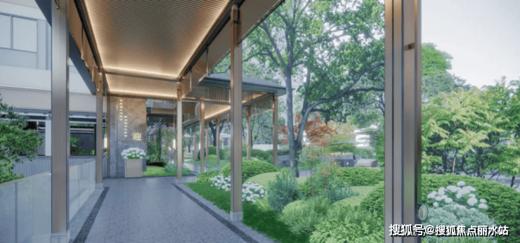同时,项目入口公园,参考苏州留园的格局,在公园亭里有“月洞门”,运用“藻井”天花,在风雨连廊里有“挂落”,把苏州留园印象搬回家。