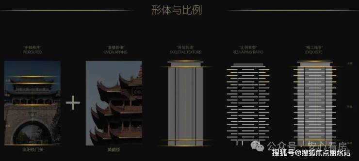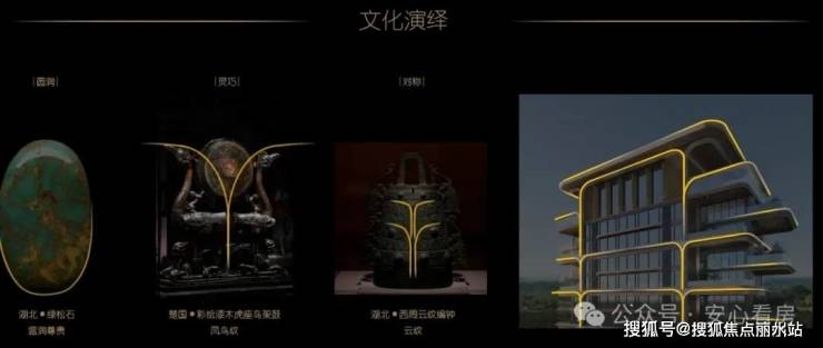 立面:选自楚汉建筑的线条制式、结合凤鸟纹、编钟云纹等符号,打造现代与古典相融合之美