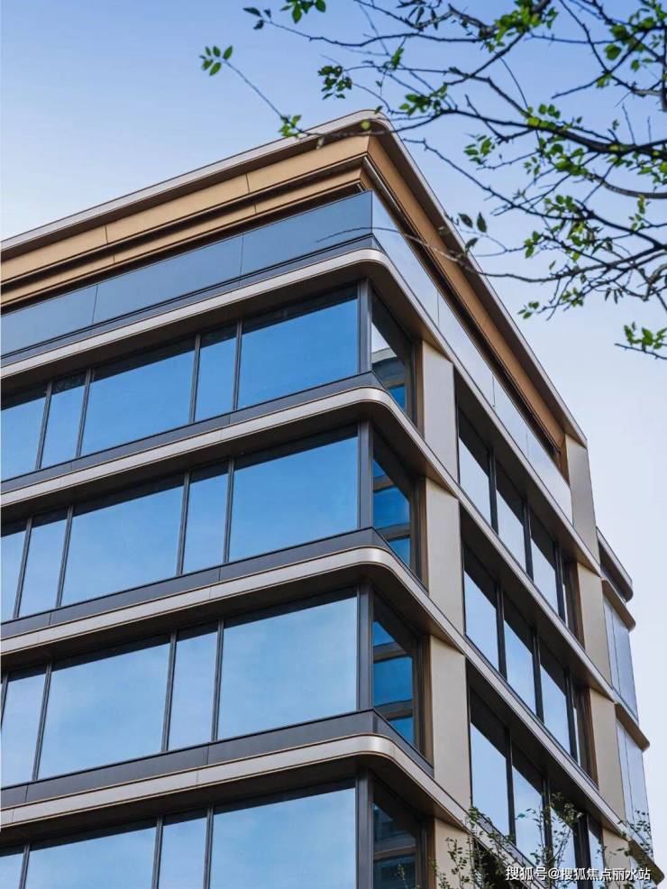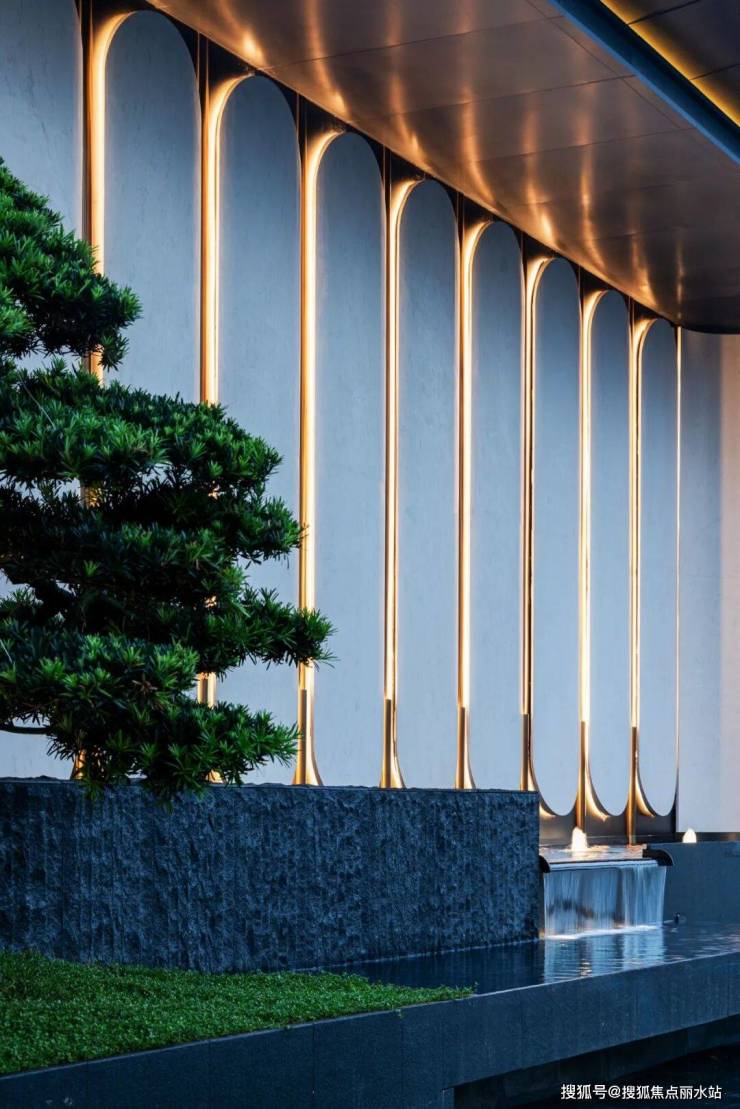 铝板+瀑布造型金属格栅+曲面弧形玻璃,整体造型轻盈且富有质感;顶部香槟金铝板塔冠,夜间可发光,足以看出开发商的用心