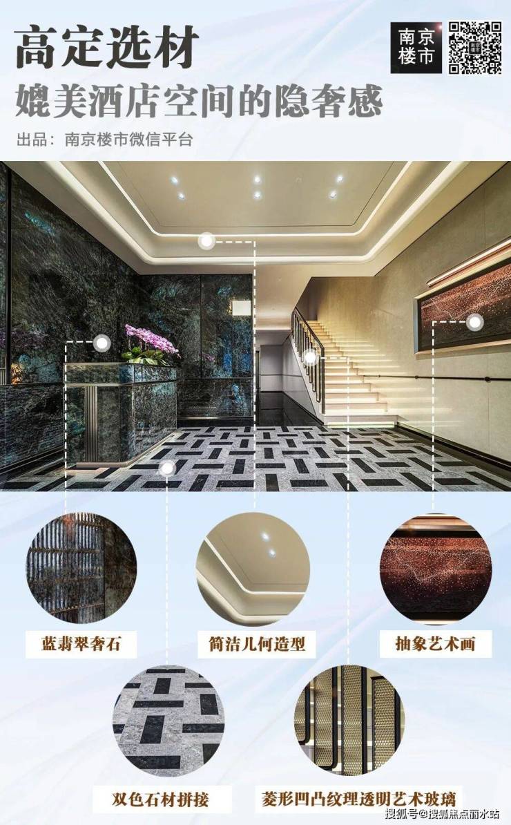 意大利蓝翡翠奢石,定格归家第一观感:洋房大堂再度焕新,墙面与前台镶嵌百万级蓝翡翠奢石,地面采用双色石材精准拼贴,呈现出兼具艺术格调与归属感的归心场域;