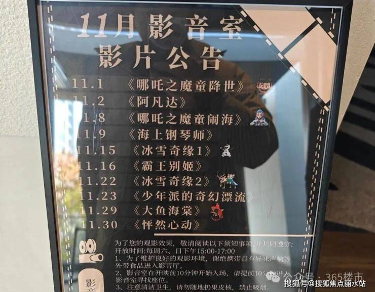 在影音室门口,物业把11月的电影排片情况公示出来,既有美国经典电影《海上钢琴师》;也有陈凯歌的巅峰之作《霸王别姬》;还有火遍全国的新时代的动画电影《哪吒》,这样的影片设置基本上涵盖了不同的业主群体。