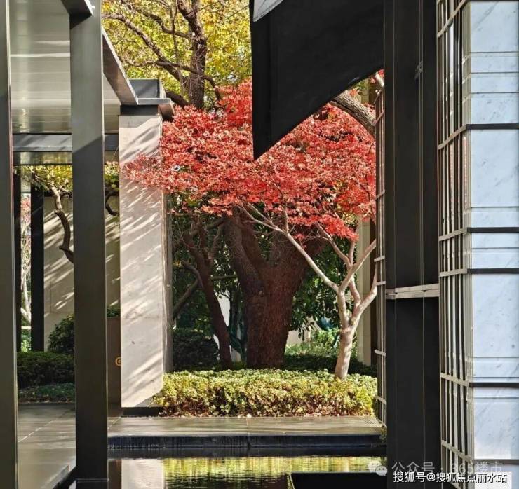 璟樾府的景观打造也是一绝,除了会所处的下沉式庭院外,项目在东侧还打造了一个体量更大的下沉式庭院空间,婀娜多姿的乌桕树与景观亭融为一体。