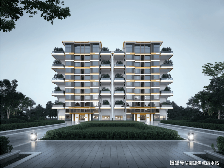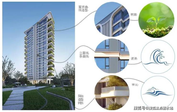 建筑以曲线起于形态,但不限于形态,立面从土地、海水、天空中提取自然元素,以树苗生长屋顶曲线造型,以波浪拟做立面线条曲线,以祥云构造阳台造型转折,并通过香槟金铝板与米白色石材的搭配,打造细腻丰富的立面效果。不仅符合建筑功能空间的要求,且在建筑里面形成韵律与节奏,使得建筑方寸之间流动变化。