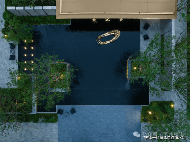 聚水归园:从小区东门进入,迎面而来的就是聚水归园核心水景景观,大幅景墙采用意大利温德姆灰大理石搭配金色线条,丛生乌桕、香橼为主体,点缀红枫、棕竹、肾蕨等植物,帆船主题雕塑静置水面,引水入园、环水而居的诗意在此绽放。