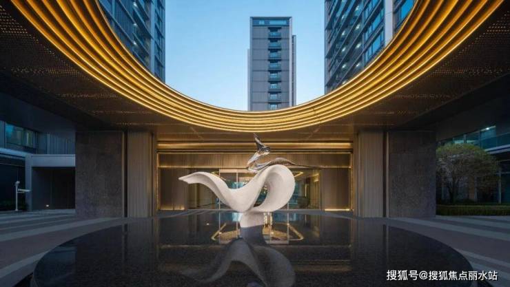 大门香槟金圆形吊顶盒盖而下,主入口广场流线型的雕塑由整块汉白玉琢成,温润如凝脂。