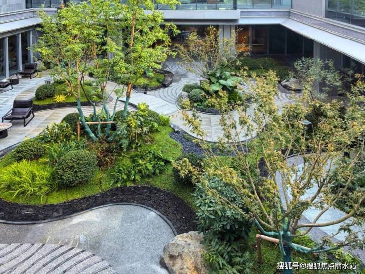 你可以安静的享受这般诗意画卷,也可以踏在胶粘石工艺的地面上,感受这如水波层层晕开的铺装……
