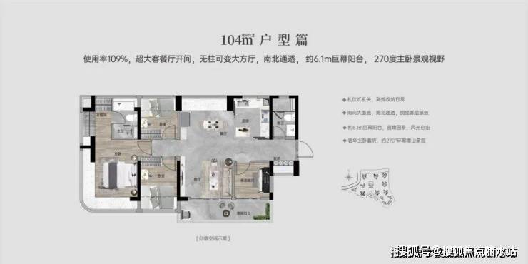 主卧拥有 270° 弧形环幕景观和宽飘窗,窗地比超 43%,达到豪宅标准,让业主能够享受到充足的阳光和优美的山景。同时,户型采用 2 梯 3 户 / 5 户排布,扭转 45° 角排布,四边位采光,前后无遮挡,每一户都能实现三到四开间南向望山景,视野开阔,通风采光效果极佳。