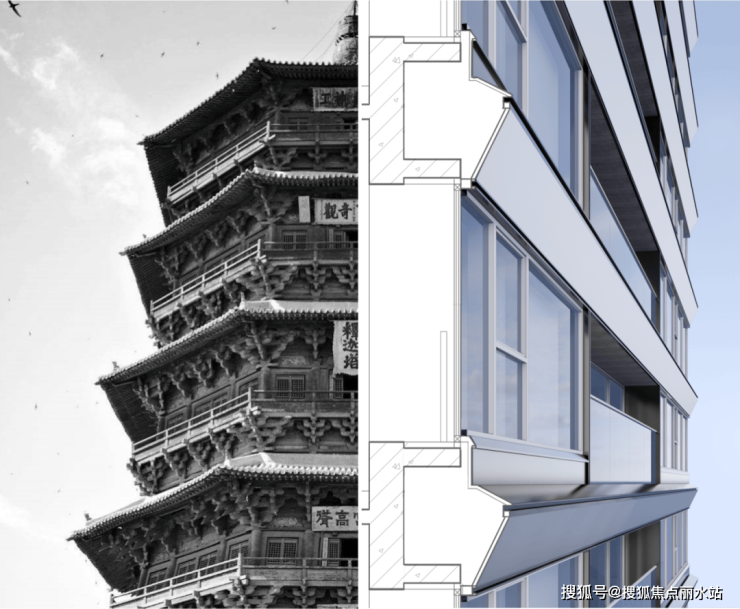 横向线条提取山西古塔檐口的比例,以现代手法演绎古典,既传承了在地文脉,亦兼具遮阳防雨的实用功能。转角弧线呼应汾河水波的流动意蕴。